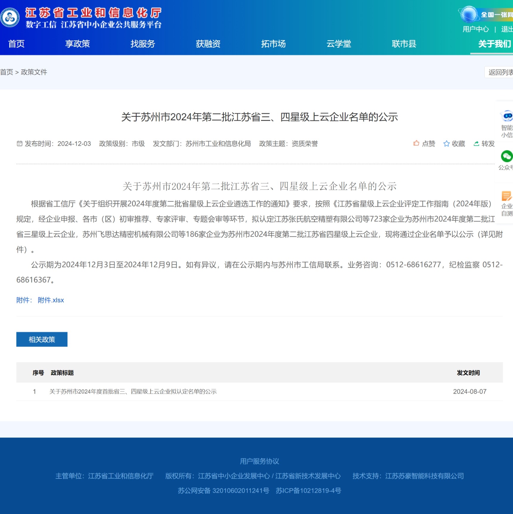 12月3日,蘇州市工業(yè)和信息化局公布了2024年第二批江蘇省三星級上云企業(yè)名單,銀河電子名列其中,獲評江蘇省三星級上云企業(yè)。星級上云企業(yè)是指企業(yè)以互聯(lián)網(wǎng)為基礎(chǔ),實現(xiàn)系統(tǒng)與設(shè)備互通、產(chǎn)業(yè)鏈上下游信息協(xié)同、數(shù)據(jù)共享的模式,有利于企業(yè)降低信息化建設(shè)成本,進而實現(xiàn)生產(chǎn)全過程、產(chǎn)品全生命周期優(yōu)化。